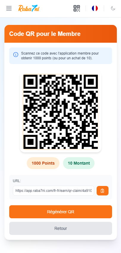 Après chaque achat, scannez le QR code présenté par le caissier pour ajouter automatiquement des points à votre compte.