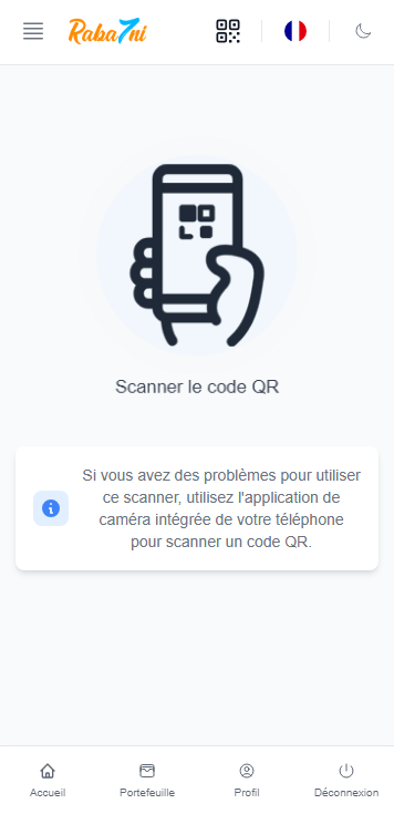 Scannez le QR code affiché dans le commerce partenaire pour commencer à utiliser leur programme de fidélité. Si vous avez déjà un compte, utilisez notre scanner QR intégré. Si vous n'avez pas encore de compte, vous pouvez utiliser directement l'appareil photo de votre téléphone.